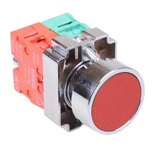 Red push button switch with 1NO and 1NC contacts, housed in a corrosion resistant metal package, suitable for standard 22.5mm mounting in industrial applications.