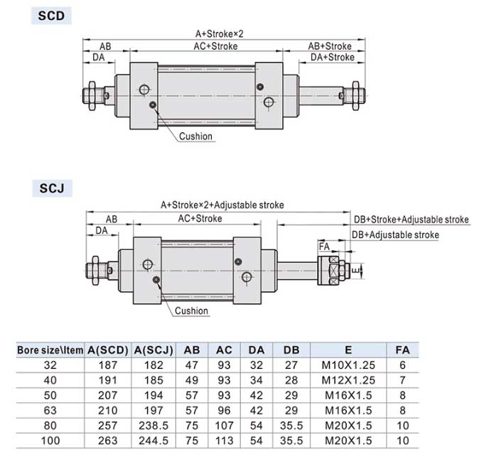 Model SC:Standard Double Acting(Pull Rod Type) SCD:Double-shaft Double Action(Pull Rod Type)) SCJ:Double Axis Double Acting Adjustable Type(Pull Rod Type) SU:Standard Double Acting(Hidden Pull Rod Type) | Cylinder Bore X Stroke | Adjustable stroke: Blank:No magnet N:with magnet 10:10mm 20mm/30mm 40mm/50mm 75mm/100mm | Magnet Code S:With Magnet Blank:Without Magnet | Fixed Type Blank:Basic type LB:Front and Back Fixed Type FA:Front Cover Fixed Type(Front Flange Type) FB:Back Cover Fixed Type(Rear Flange Type) CA:Back Cover Fixed Type(Single Earring) CB:Back Cover Fixed Type(Double Earring) TC:Swinging Type TC-M:Swinging Type Attaching Foot Seat |