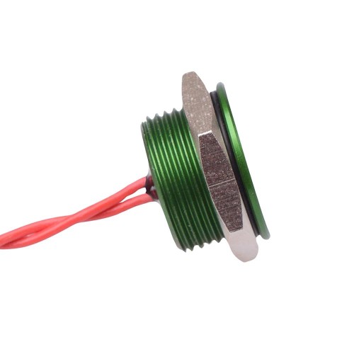 Body material: green anodized Body colour: green Panel cut-out: 16.2mm Contacts: SPST-NO Protection rating: IP68, IP69K mounted on panel Rating: 200mA 24VAC/DC Terminals: flying leads Bushing: flat operator, 1mm height Diameter: 18mm